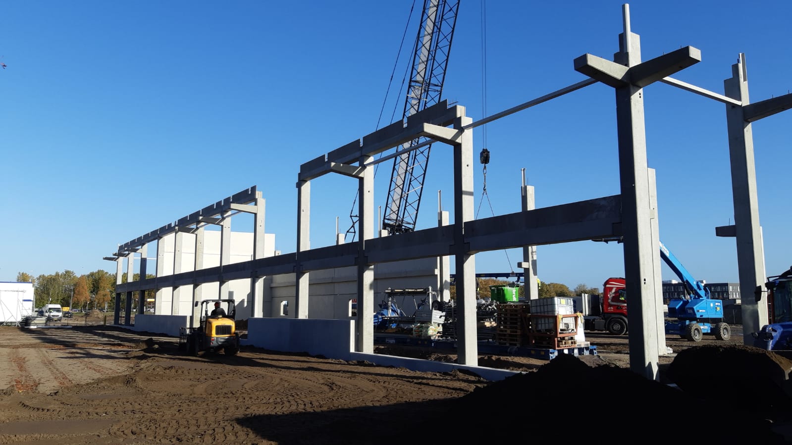 De grondwerkzaamheden zijn afgerond, de fundering ligt erin en vandaag zijn de eerste kolommen gearriveerd. We zijn dan ook meteen van start gegaan met de montagewerkzaamheden!